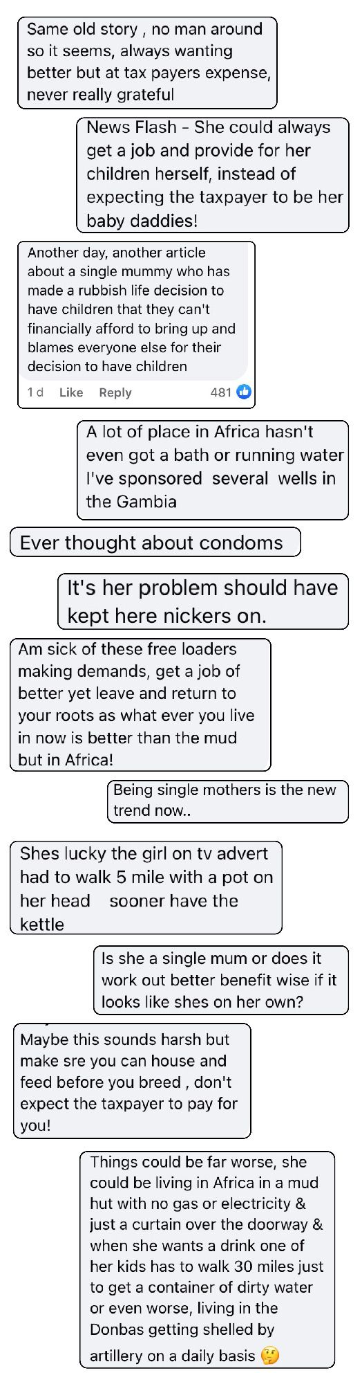 You can be certain that none of those commenting have bothered to read the article before they start yapping all their ‘don’t breed if you can’t feed’, or ‘should have kept her knickers on’ nonsense. The narrative they have decided based on a handful of words is that the woman is fraudulently claiming benefits, has never worked a day in her life and must be hunted down.